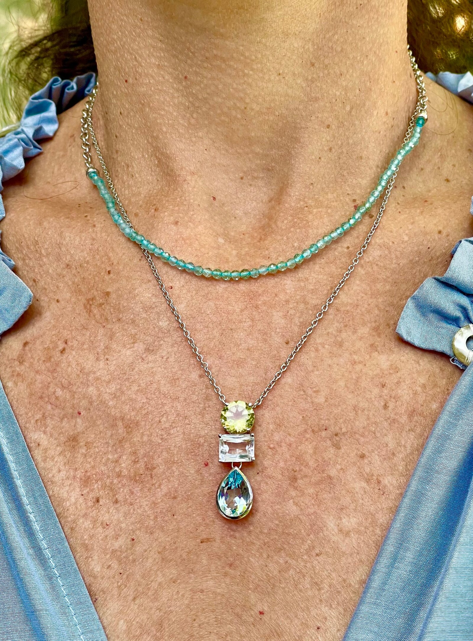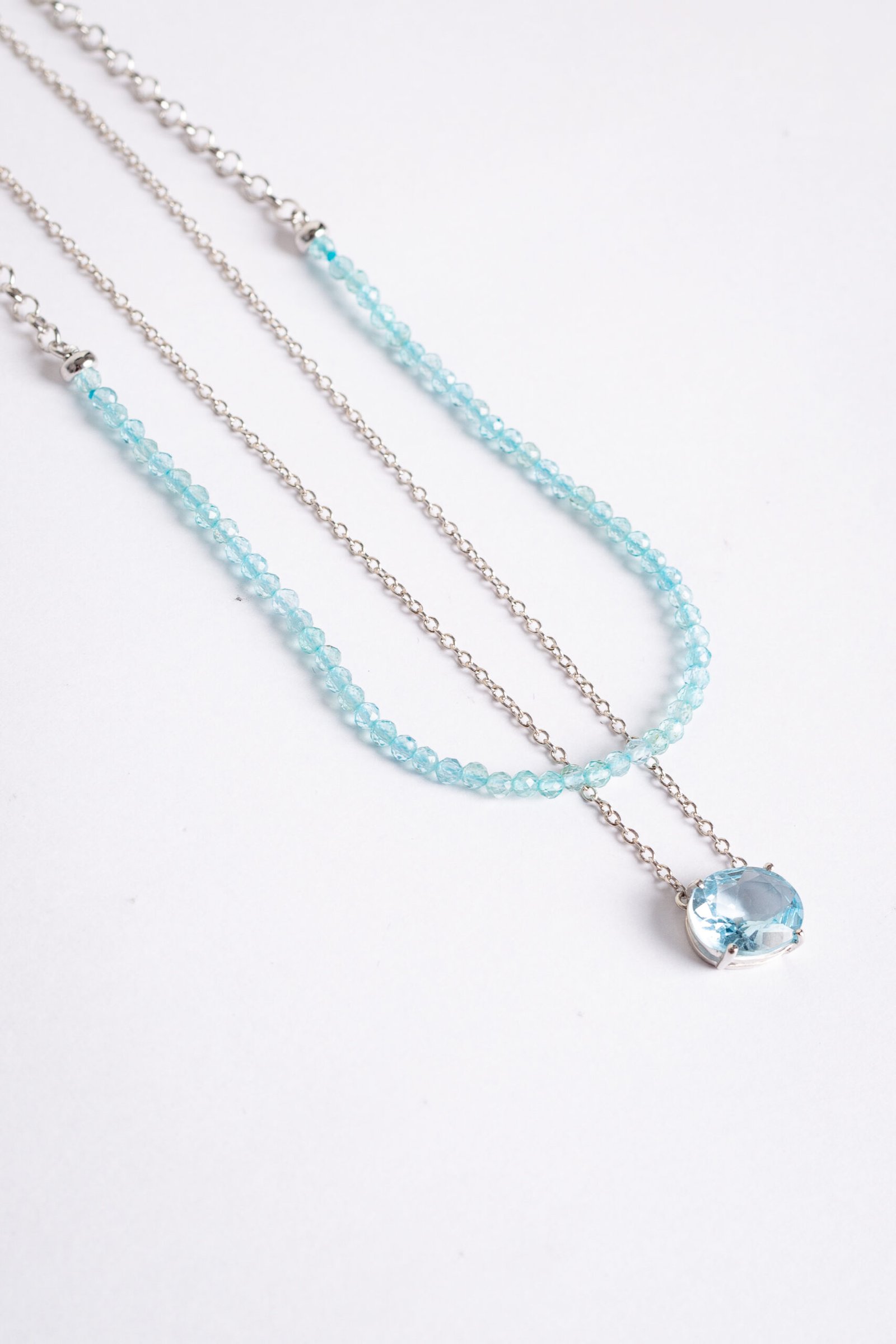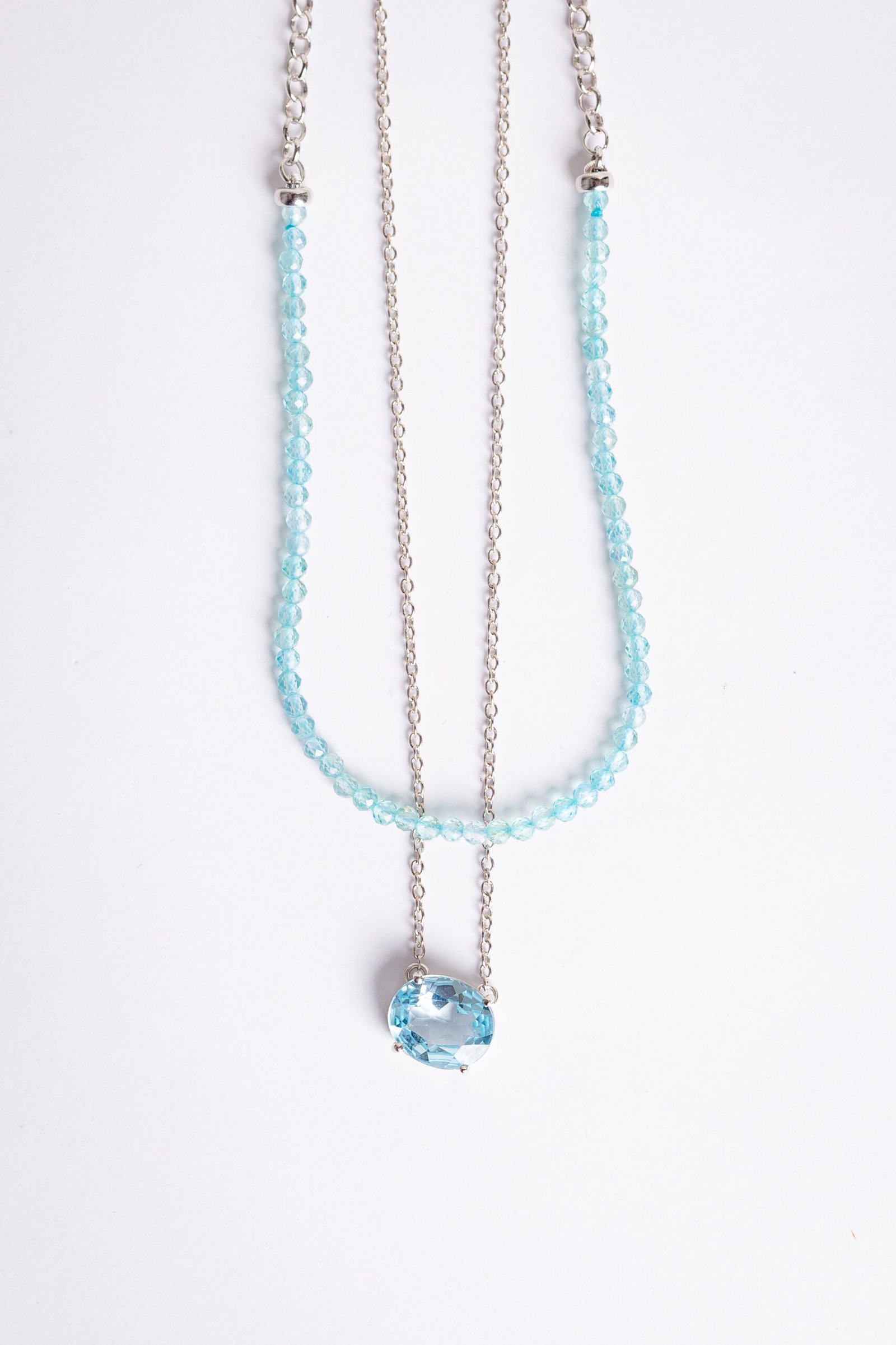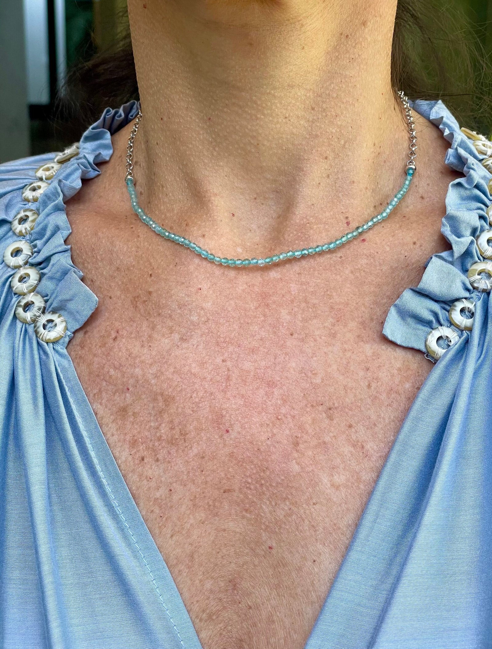 Colar Choker de Apatita Azul e corrente elo português de prata com banho de Ródio.