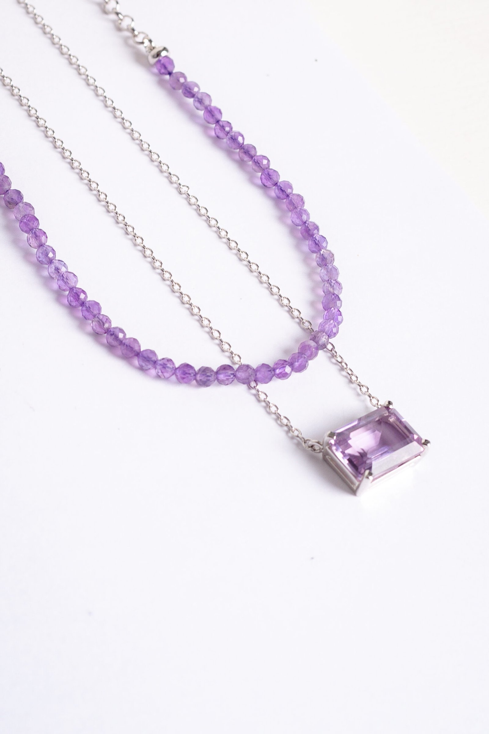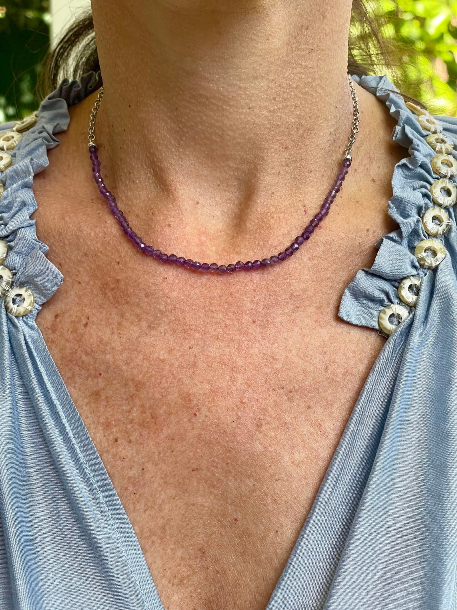 Colar choker, mais curto, ideal pra ser usado com outros colares ou sozinho. Corrente elo português de prata com banho de ródio com fio de ametista.