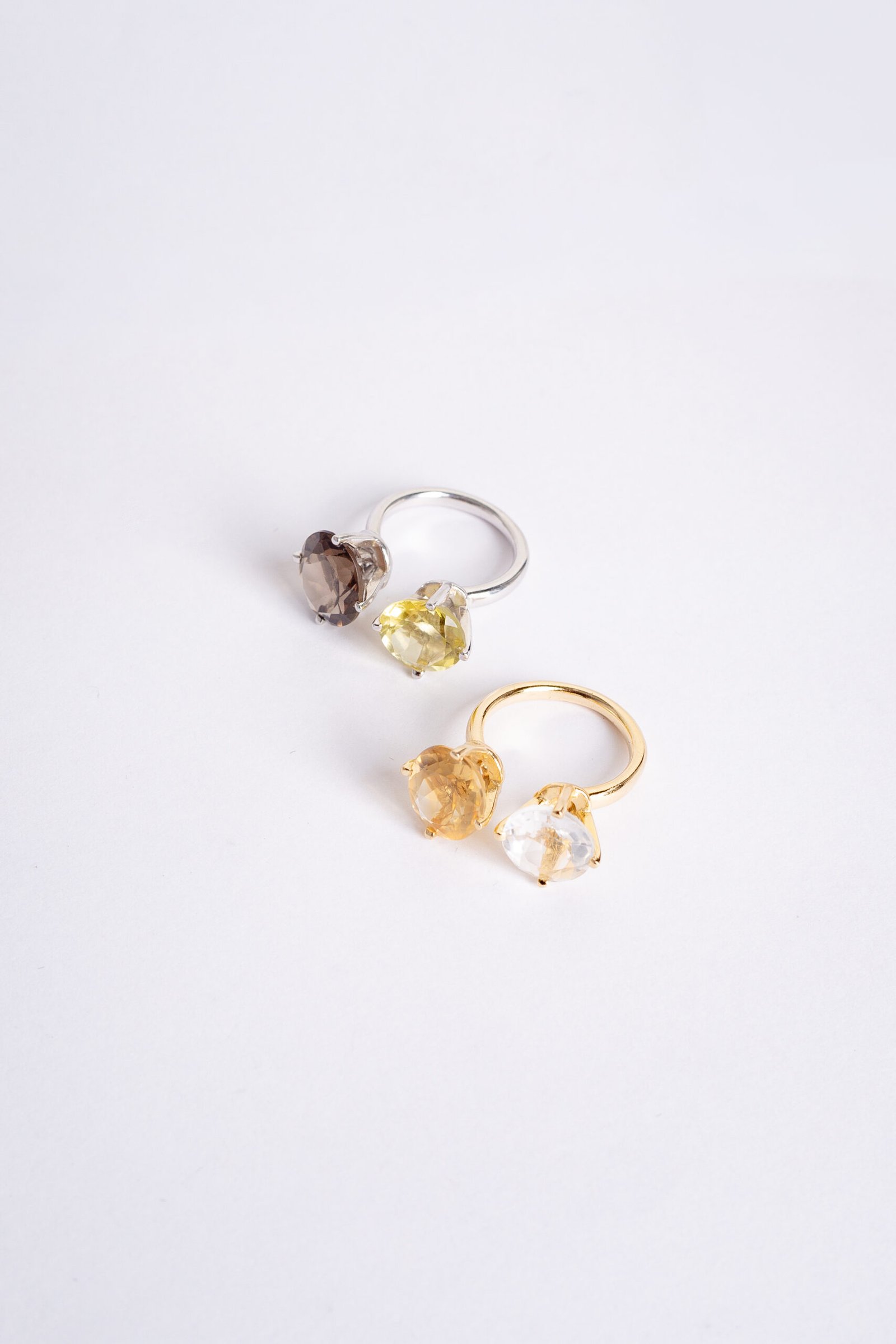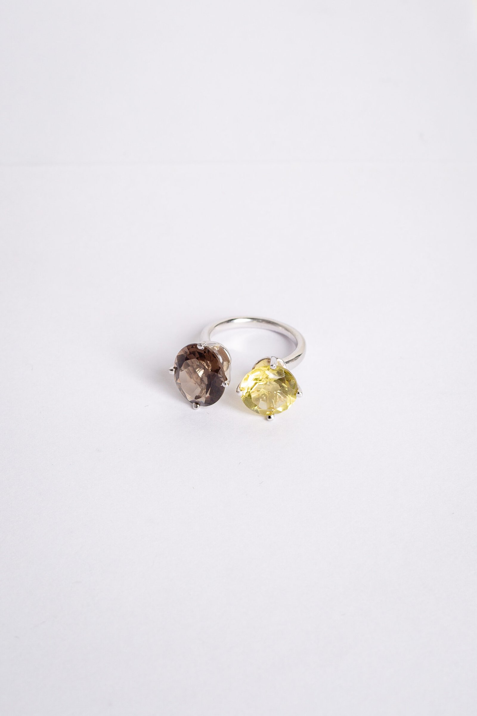 Anel de Prata com Green Gold e Quartzo-fumê, banhado no Ródio.