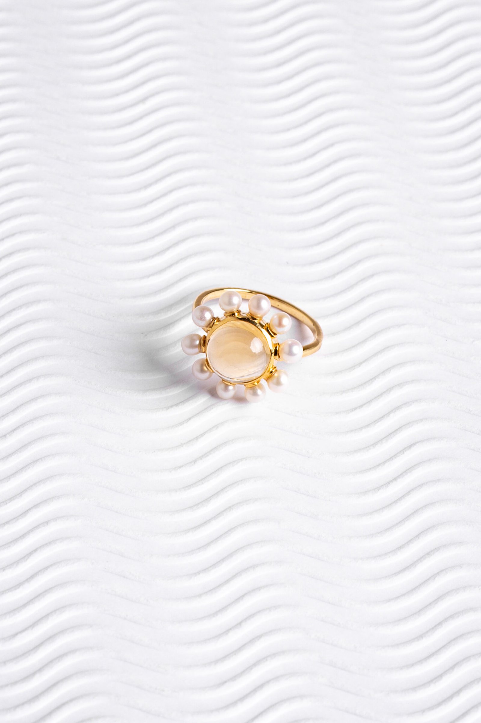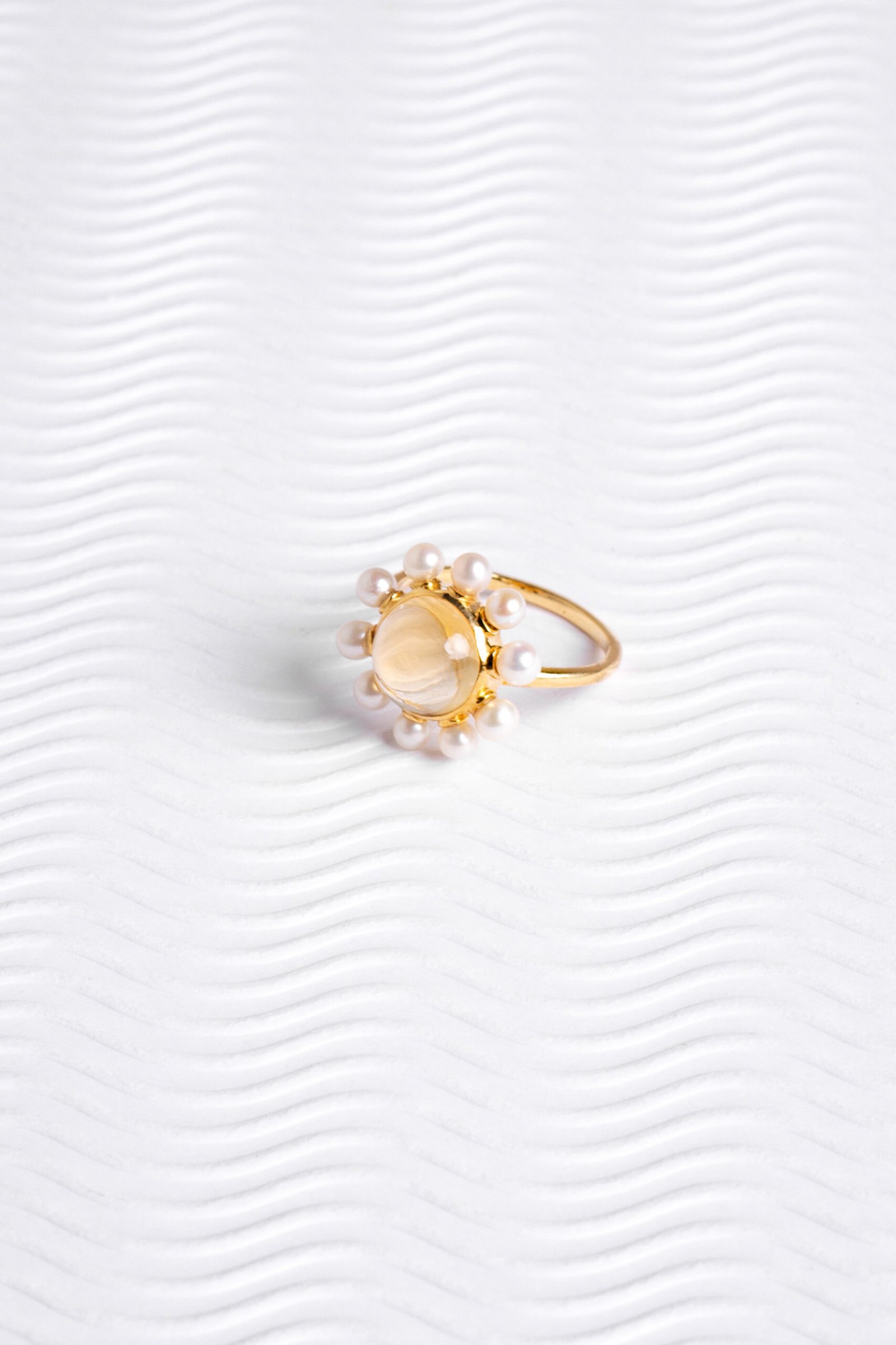 Anel de Prata com Pérola e Citrino Cabochão, banhado a Ouro 18k.
