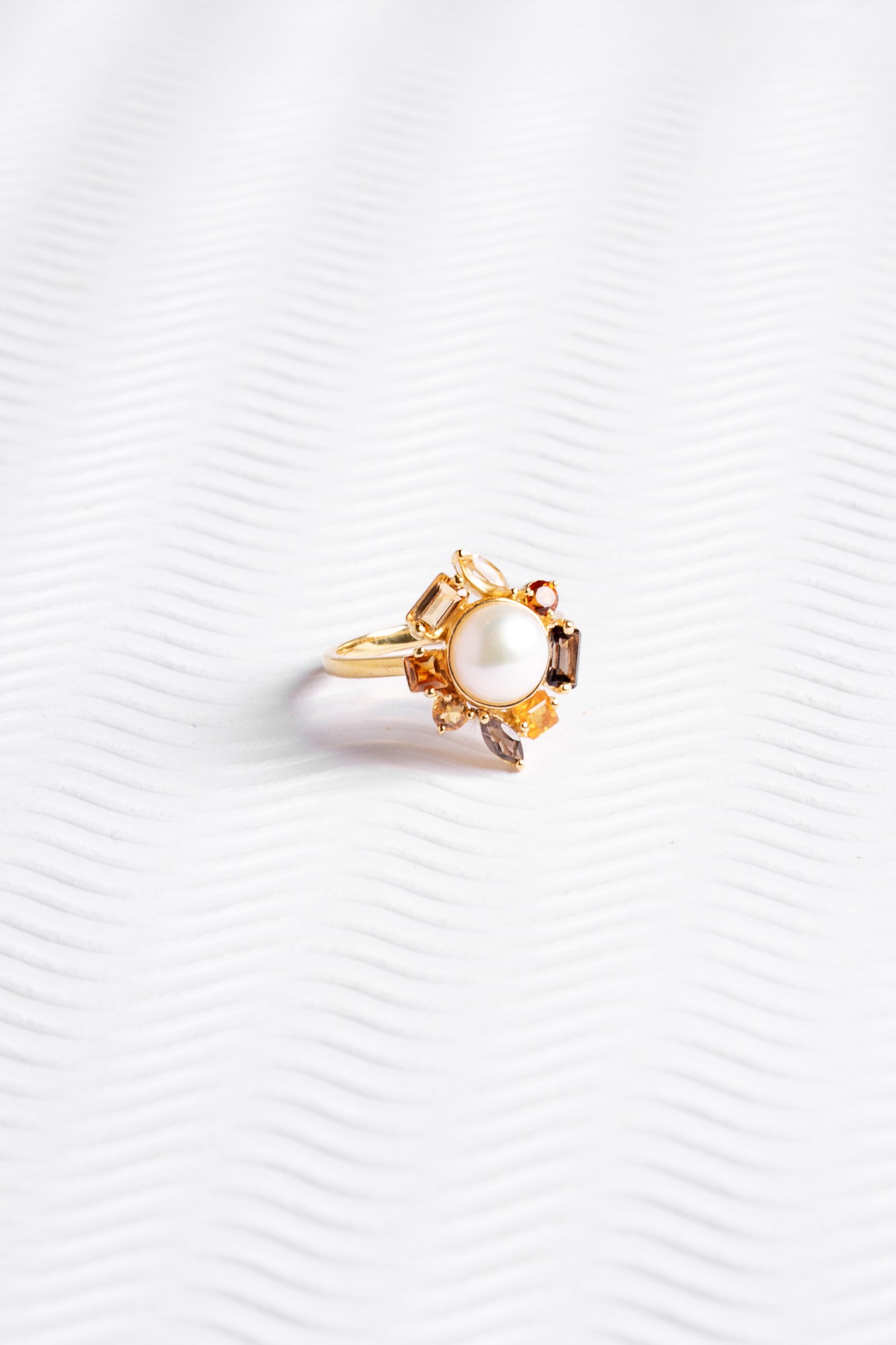 Anel de Prata com Pérola, Citrino, Citrino Rio Grande e Quartzo fumê, banhado a Ouro 18k.