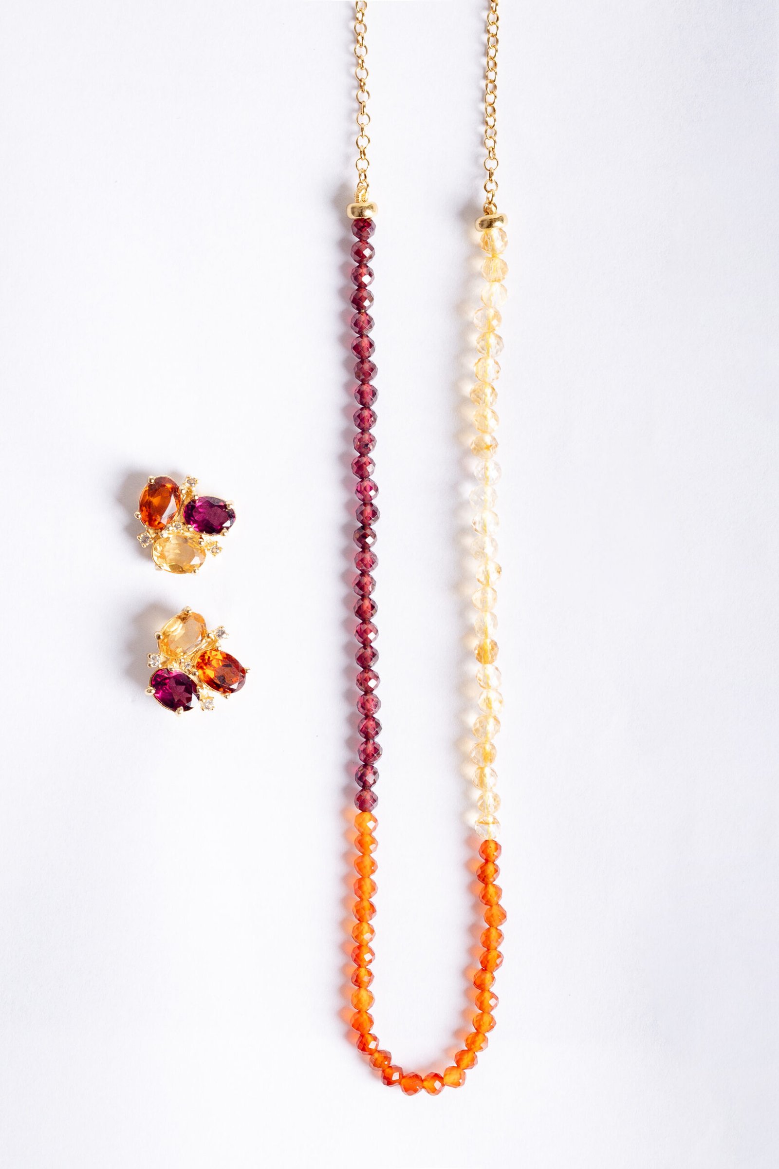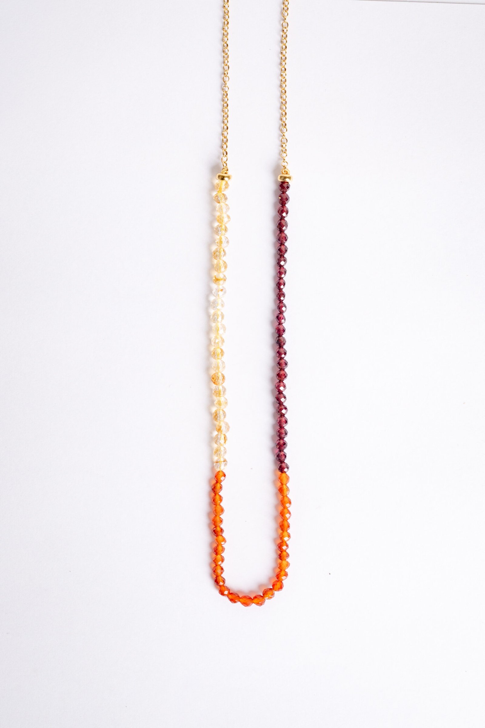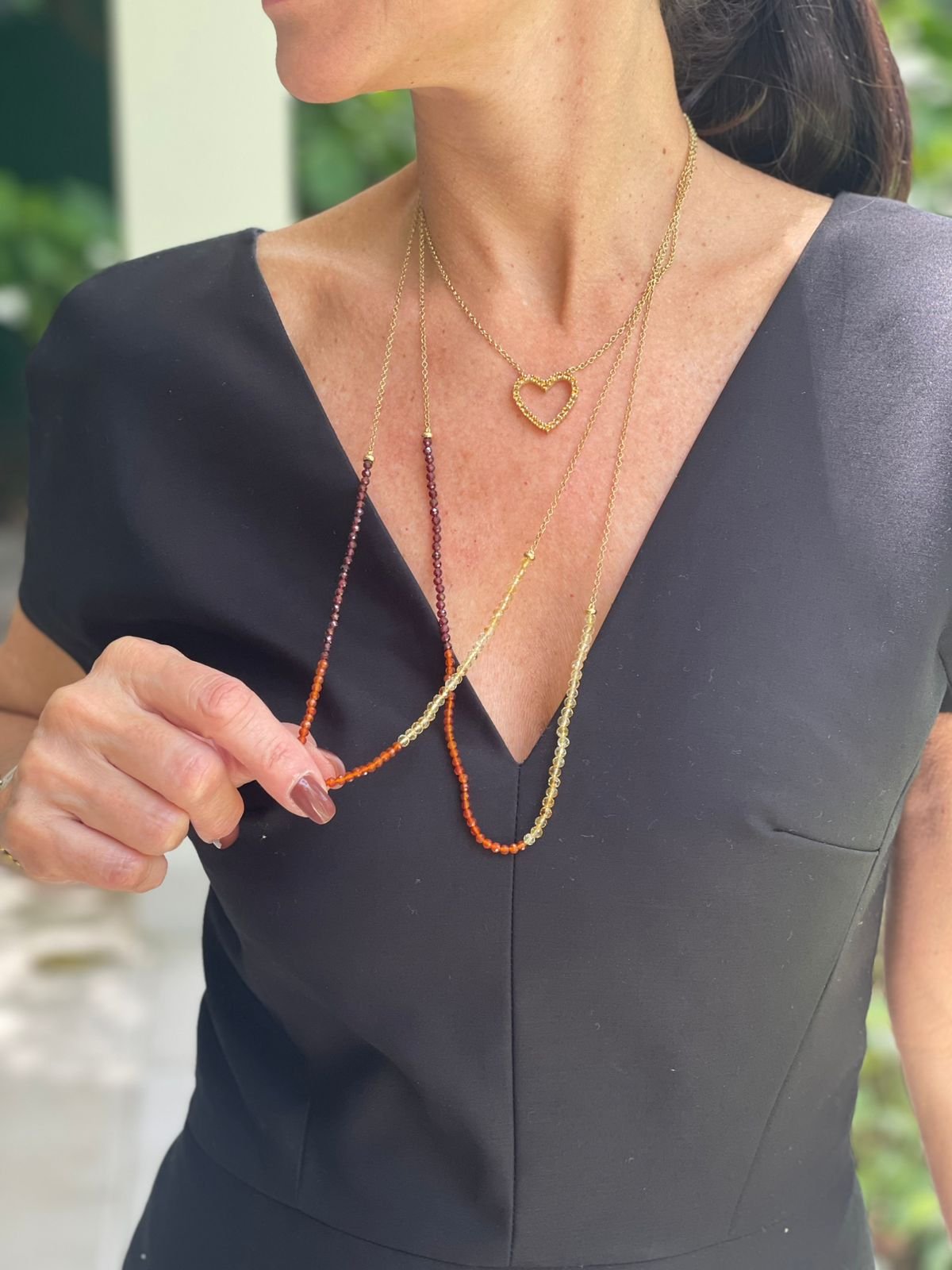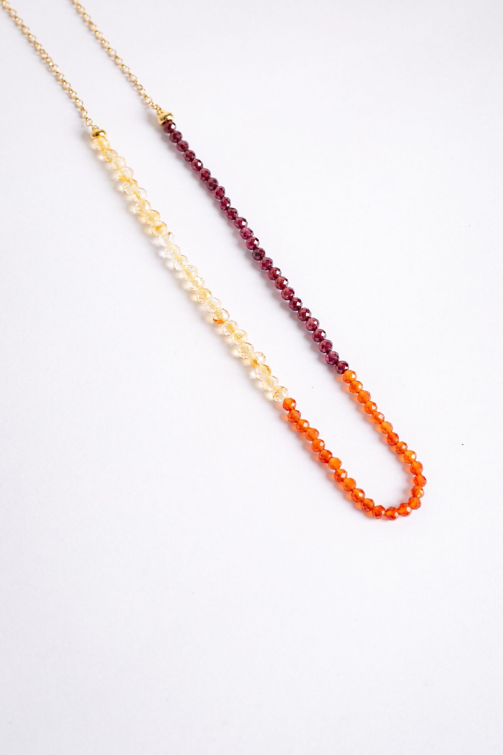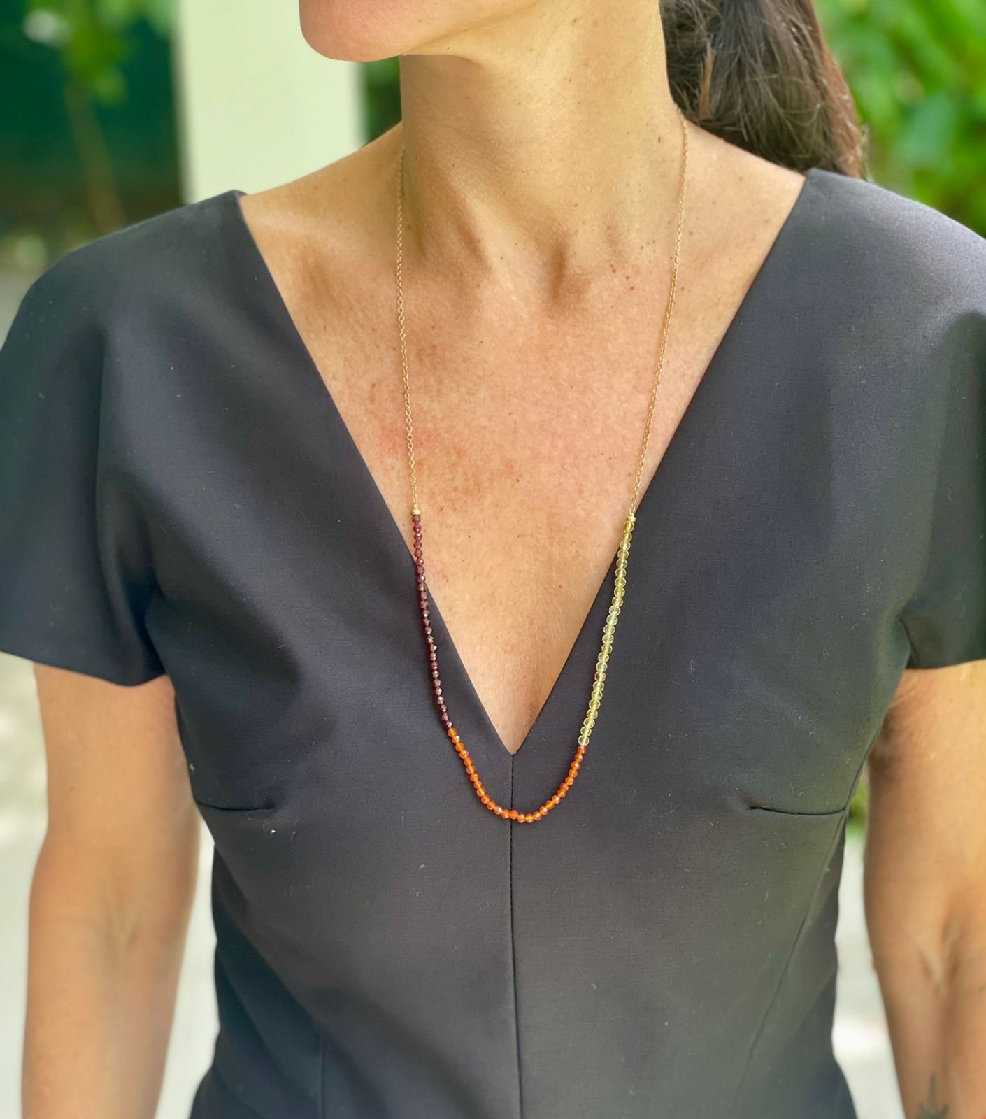 Colar fio de Citrino, Cornalina e Granada, com acabamento de corrente de prata elo português de 2mm banhada a Ouro 18k.