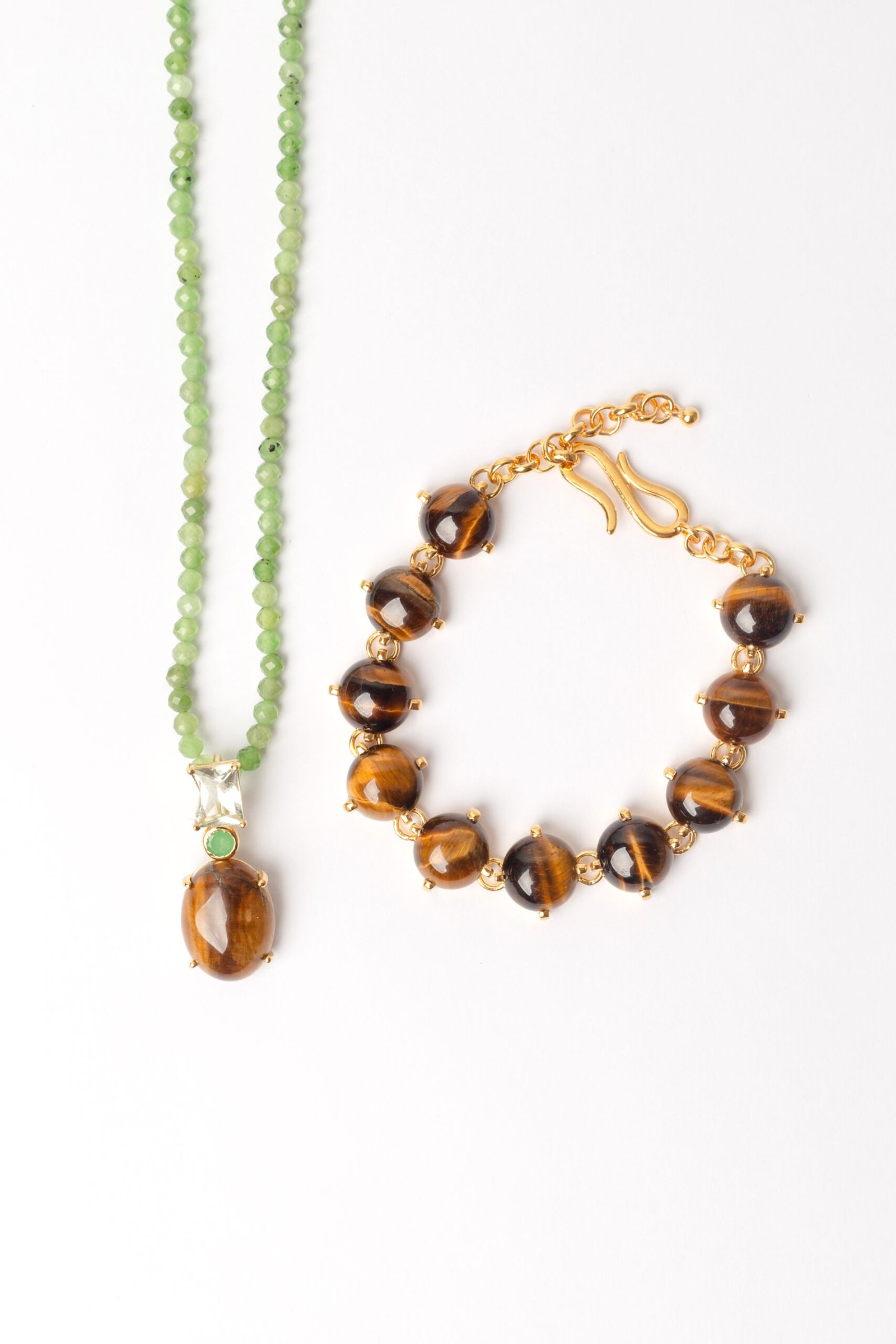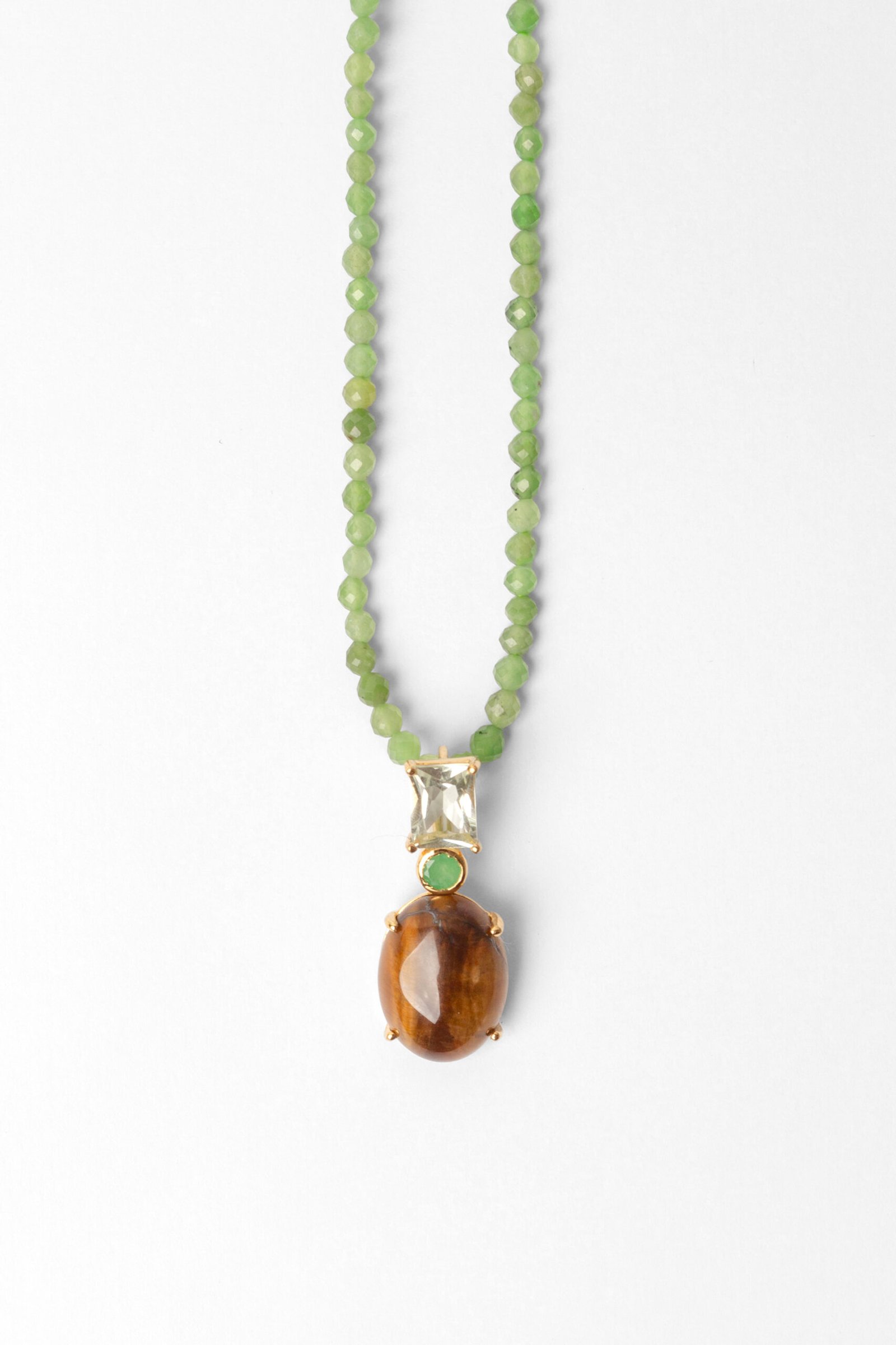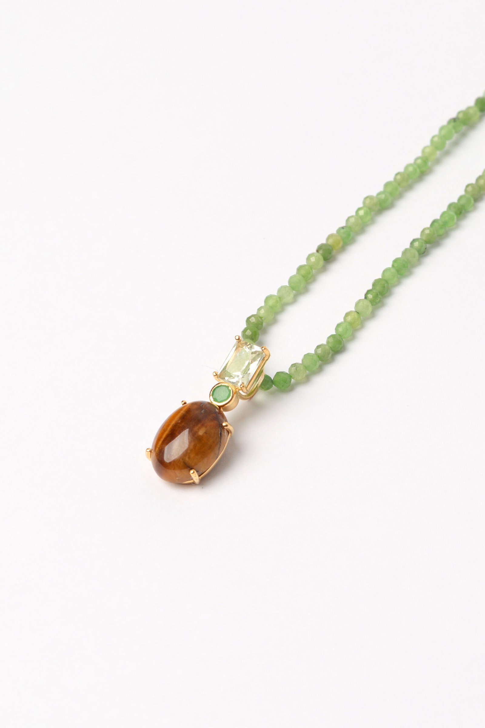 Colar Curto de Apatita Verde, com pingente Joy de Olho de Tigre, Jade Malásia e Prasiolita, banhado no Ouro 18k.