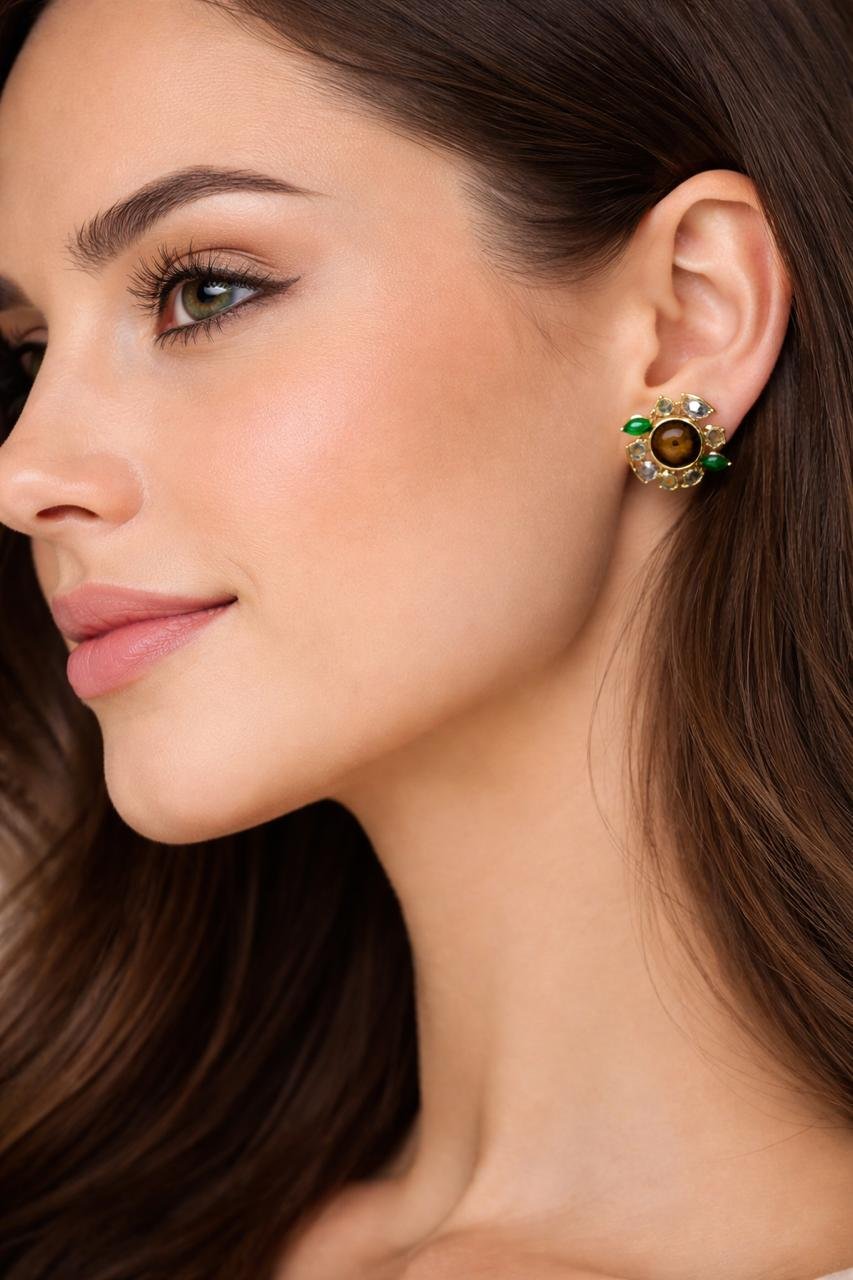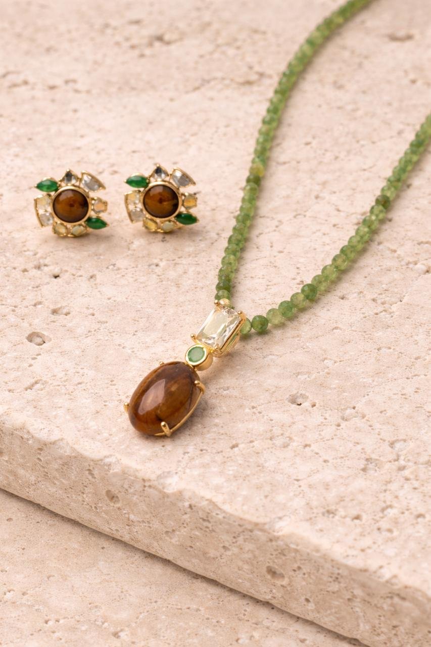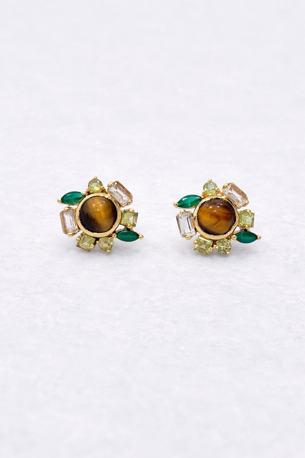 Brinco de Prata com Olho de Tigre Cabochão, Peridoto, Crisoprásio e Prasiolita, banhado a Ouro 18k.